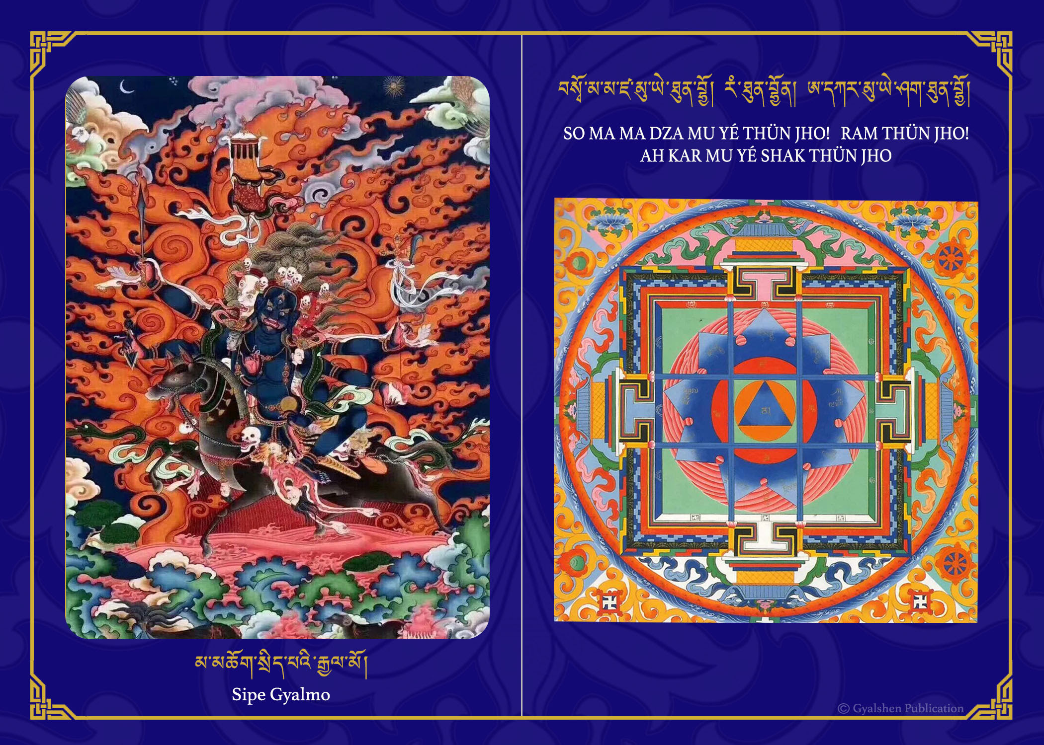 The supreme emanation of the protector deity of Yungdrung Bön, Sipe Gyalmo, not only protects but also blesses the practitioner with the power to heal. This healing power has been transmitted continuously through the ages without interruption, from Yeshe Walmo, another aspect of Sipe Gyalmo herself, to Bön teachers of our present day.